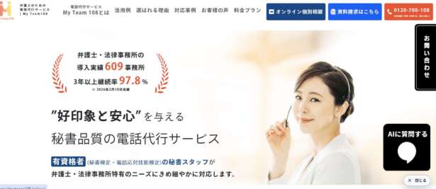 MyTeam108は、弁護士・法律事務所向けの電話代行サービスです。そのため、弁護士・法律事務所の導入実績が豊富です。